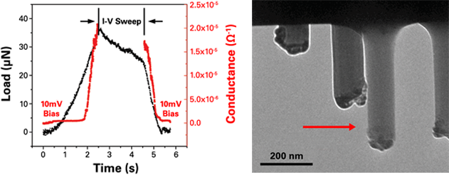 Caption: Electrical characterization during compression ofn-doped VLS-grown silicon nanopillar. D.D. Stauffer, Ph.D.Thesis, “Deformation Mechanisms in Nanoscale BrittleMaterials,” University of Minnesota (2011) pp. 150-152.