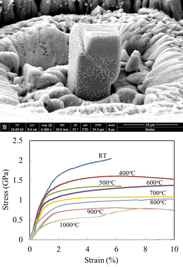 Caption: Pillar compression of Ni-Based superalloy at1000°C (top) and stress-strain plots from in-situ pillarcompression tests of bond coatings (bottom).